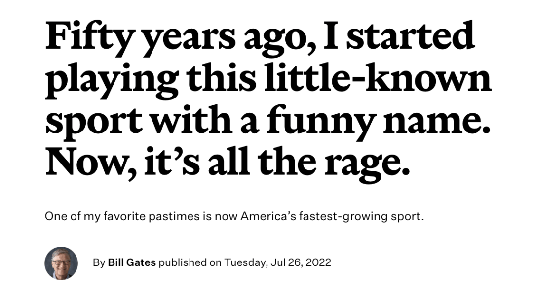 去年Taylor Swift的一条生活视频里打匹克球的镜头一闪而过,但被无数人捕捉到。比尔盖茨说他已经打匹克球超过50年——他这么说完全没错,匹克球本是一项诞生于普通美国人庭院中的游戏,融合了网球、羽毛球、乒乓球的特点,简单易上手,早期就是老人小孩在玩,被叫成“老头乐”。