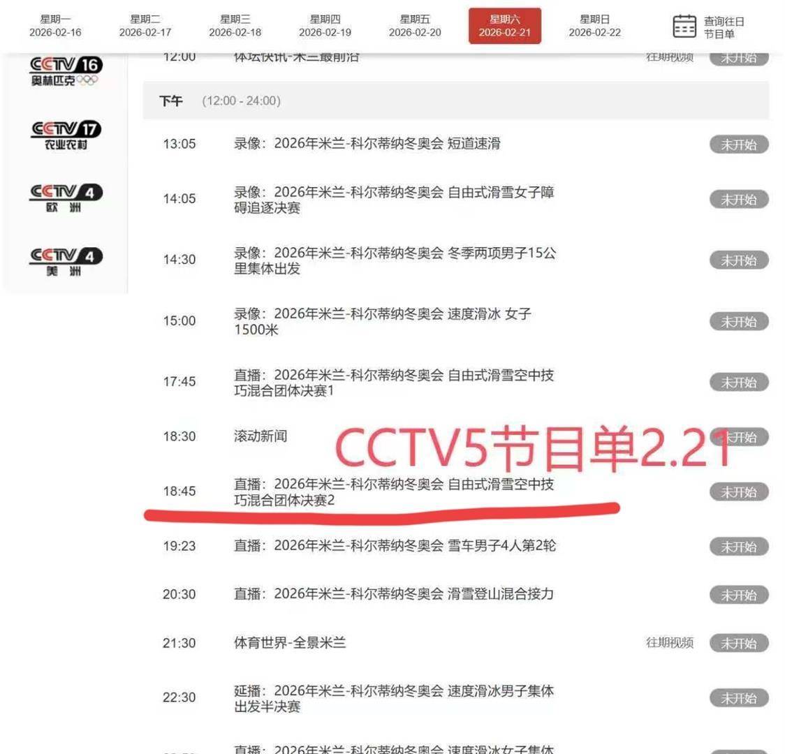 真正的重头戏从傍晚开始。 CCTV5在17点45分准时切入直播信号,节目名称为“自由式滑雪空中技巧混合团体决赛1”。 短暂的滚动新闻后,于18点45分继续直播“自由式滑雪空中技巧混合团体决赛2”。 这意味着观众可以完整见证中国队冲金的整个过程。