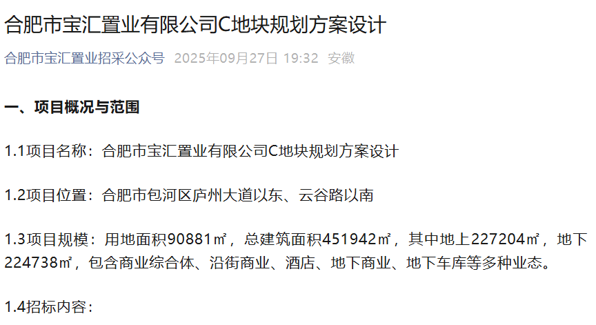 滨湖宝能城商业地块迎来实质性进展,合肥市宝汇置业有限公司C地块规划方案设计启动招标。项目规模宏大,用地面积90881㎡,总建筑面积451942㎡,包含商业综合体、沿街商业、酒店等多种业态。值得注意的是,项目地上建筑面积达22万方,相当于两个瑶海万达的规模,且投标资格要求具备华润高端商业综合体设计经验,预示着项目品质值得期待。