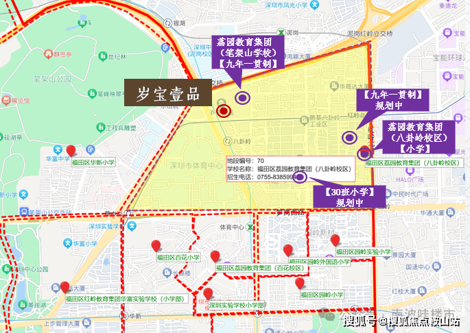 5、教育氛围——荔园教育集团(八卦岭校区)已于2022年9月开学,是本项目的临近学校,且项目西侧由岁宝代建的荔园教育集团(笔架山学校)已于2024年12月开学,项目北侧为深圳中学,整个片区教育氛围浓厚。本项目临近之学校的申请学位及落户条件以政府(包括但不限于教育主管部门)颁布的政策及学校规定为准,开发商不做任何承诺。