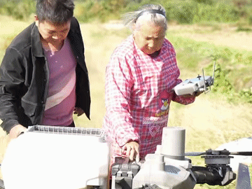 安徽省桐城市新渡镇老梅村,植保无人机在空中为一片麦田施肥,田边手拿遥控器的是82岁的戴淑英,她的孙子王甜甜在一旁指导。