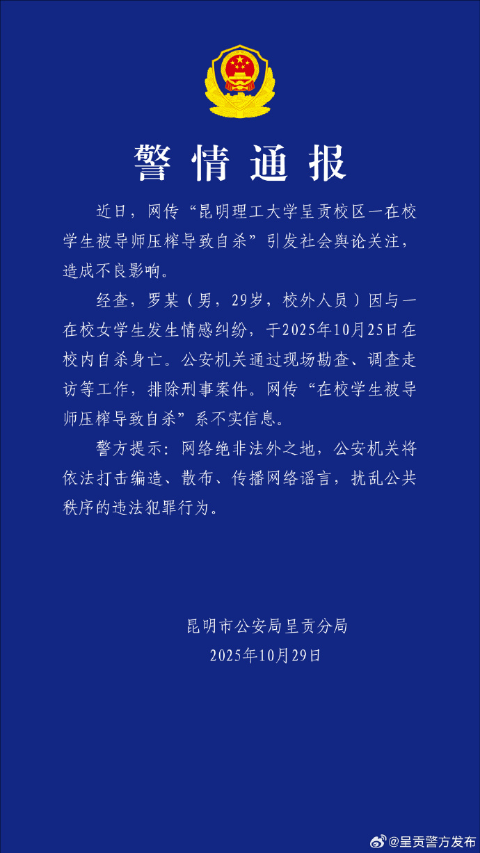 昆明警方辟谣“一在校大学生被导师压榨导致自杀”:男子因情感纠纷自杀身亡。