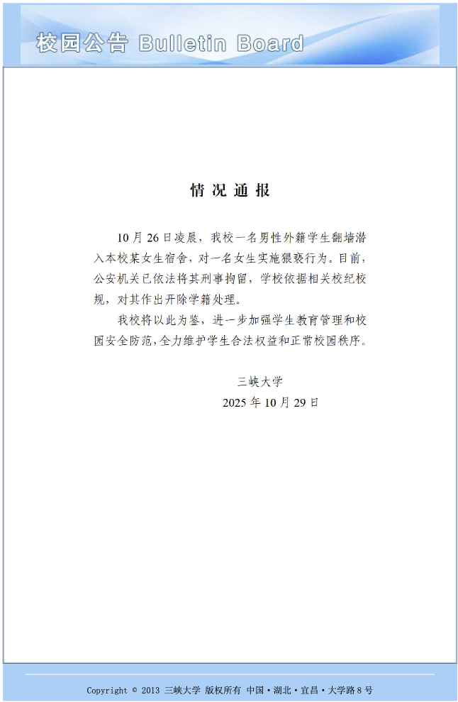 三峡大学通报男性外籍学生翻墙潜入女生宿舍实施猥亵:开除学籍。