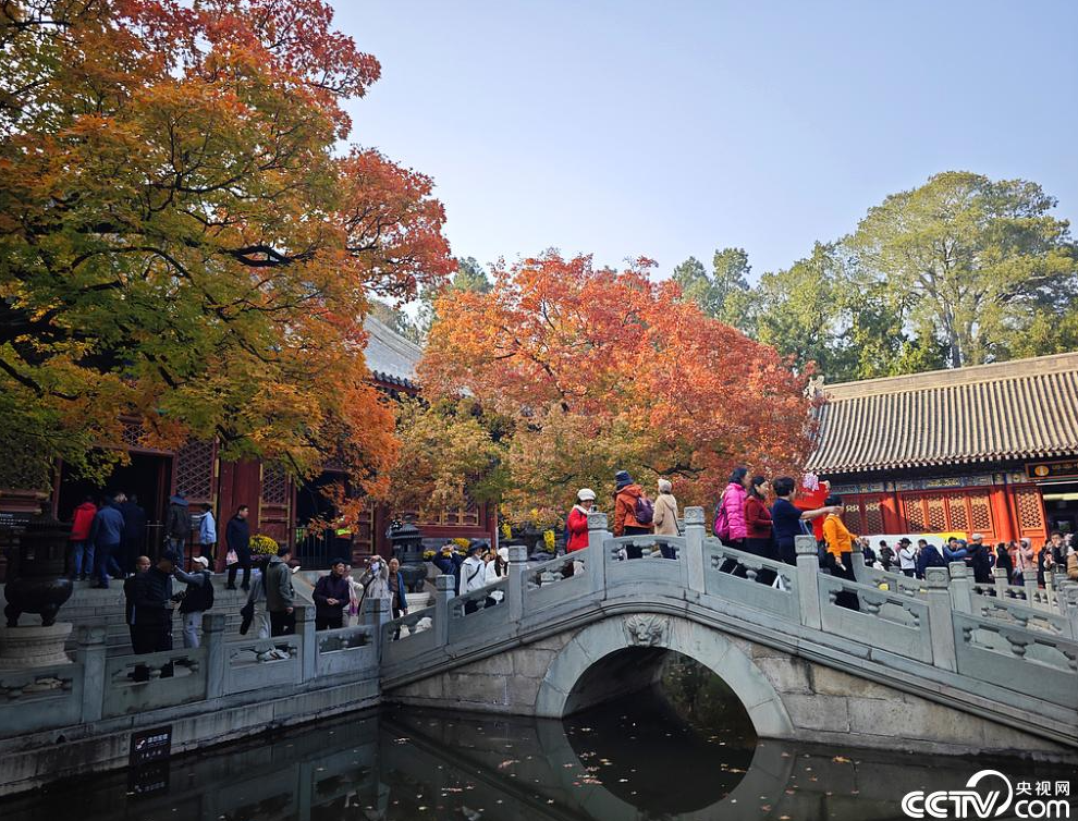 近日,香山公园勤政殿前栽植的“消息树”元宝枫已进入变色中期,橙红的叶片与皇家殿宇彩画、香炉、窗棂相映成趣,尽显古韵秋华。