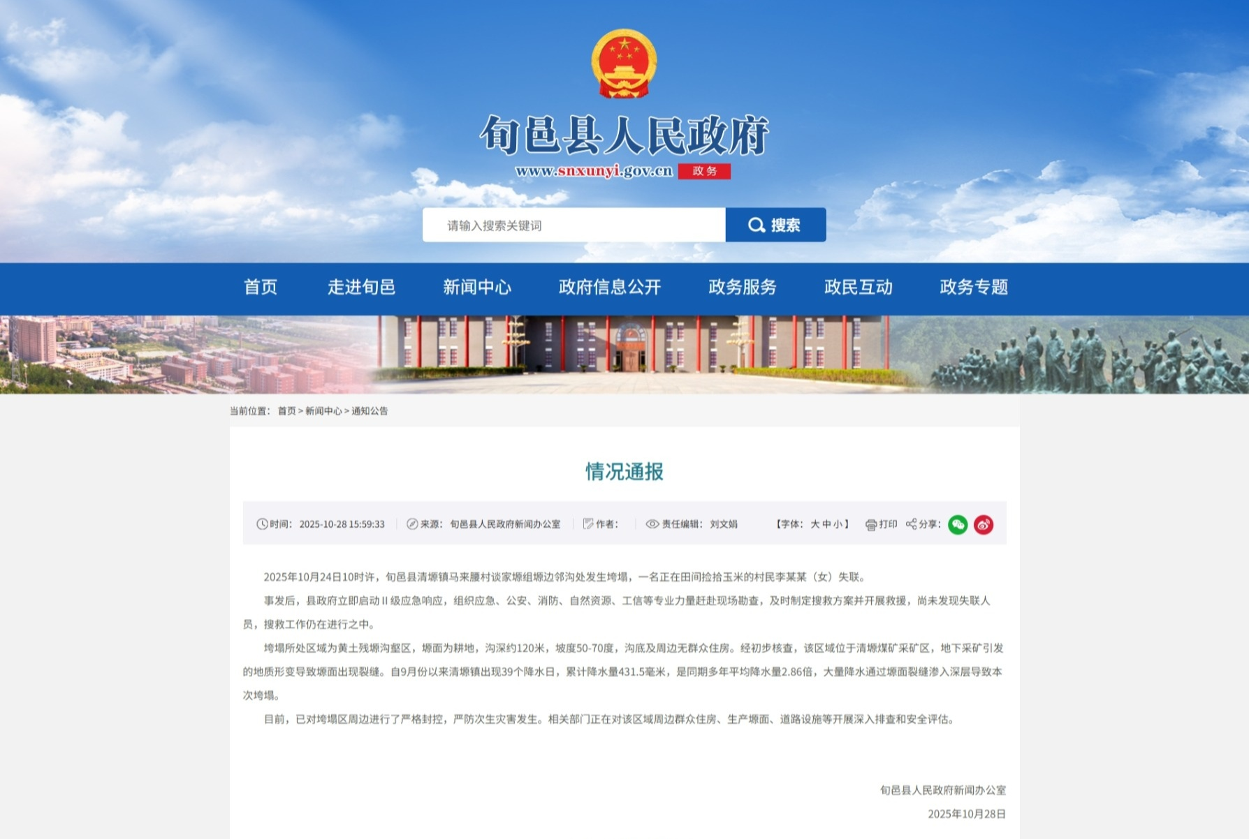 陕西旬邑一农妇收玉米时遇山体坍塌失联,官方通报:仍在全力搜救中。