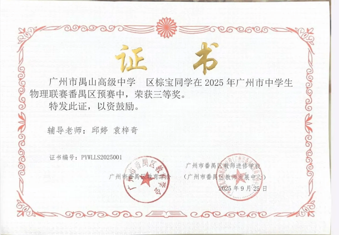在广州市中学生物理联赛番禺区预赛中,袁梓奇、施艺芬、邱婷老师指导赖雨泽同学荣获二等奖,区棕宝同学荣获三等奖。