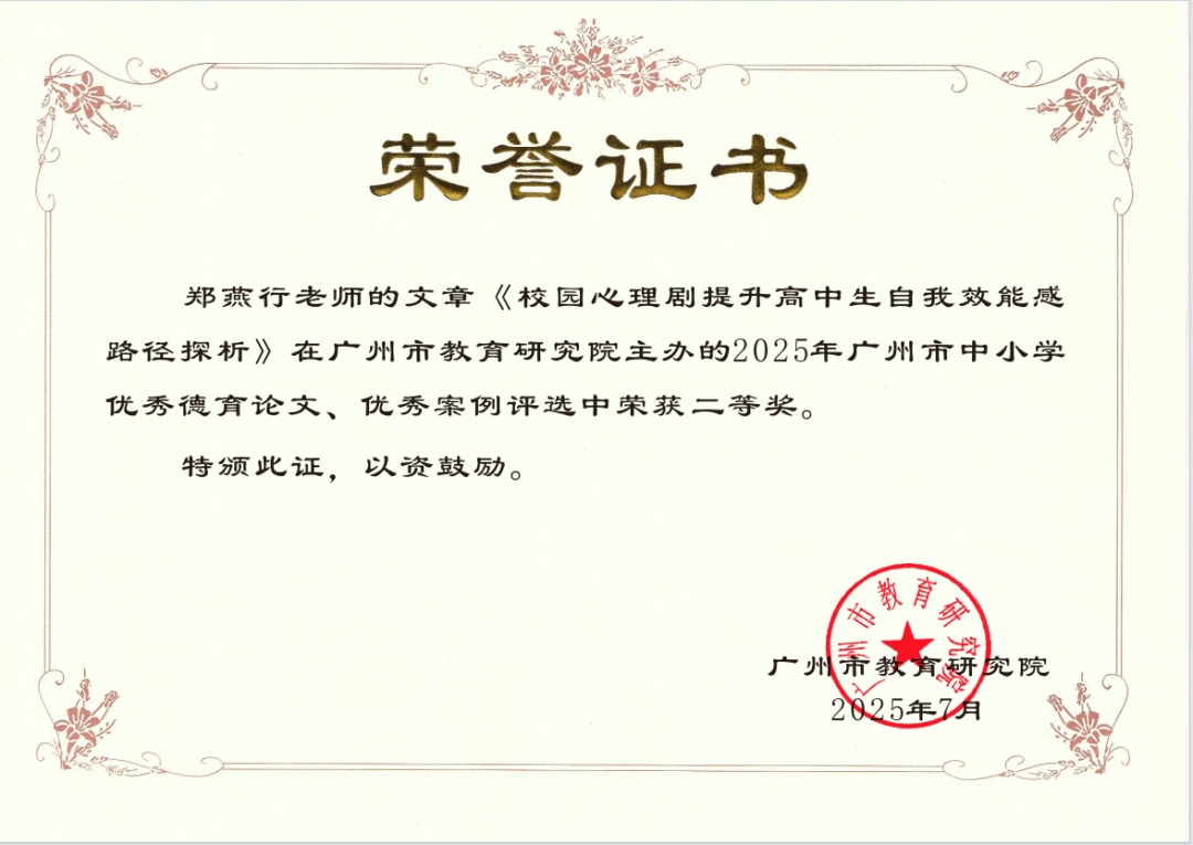 在2025年广州市中小学优秀德育论文、优秀案例评选中,郑燕行老师的论文荣获二等奖。