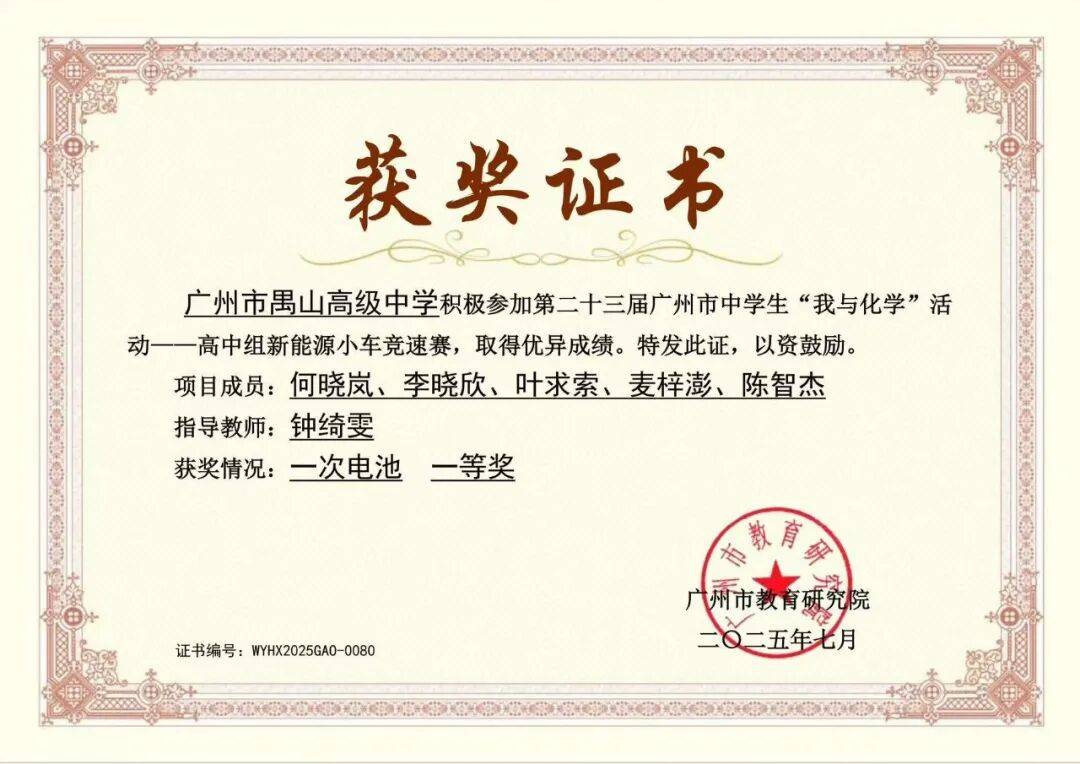 在2025年广州市“我与化学”活动高中组新能源小车竞速赛中,钟绮雯、王晓敏、黄彩霜、吴伟平等老师指导的参赛队伍全部荣获一等奖,获奖人数及名次均在番禺区位列第一。