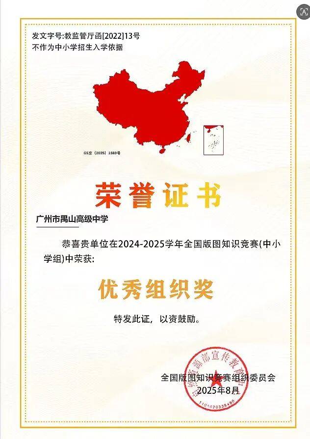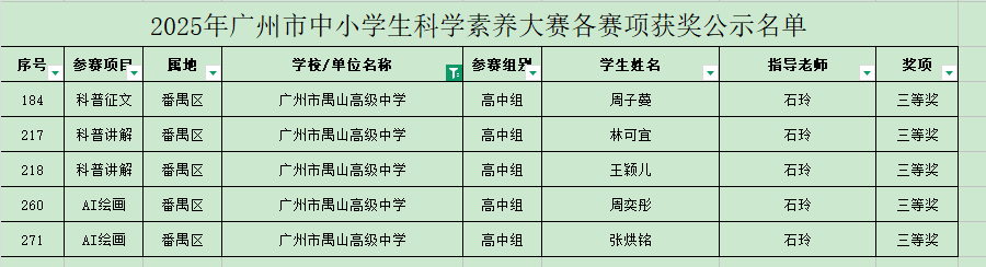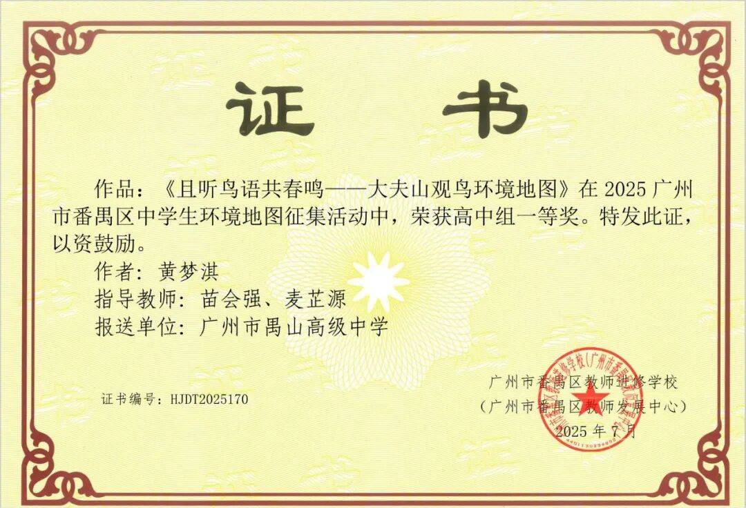 在2025年广州市番禺区中学生环境地图征集活动中,石玲、李慧仪、苗会强、麦芷源等老师被评为优秀教师,蔡樱棋、黄梦淇同学荣获一等奖,赵晓柔等6位同学荣获二等奖。