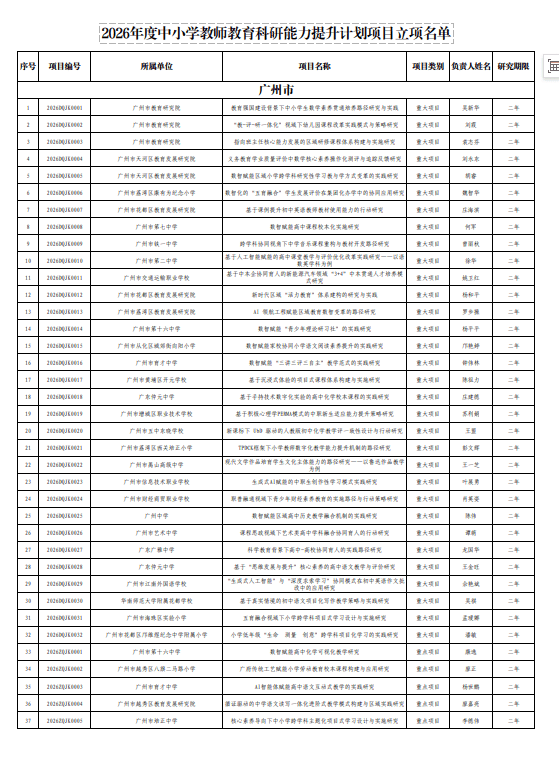 在“广东省教育科学规划2026年度中小学教师教育科研能力提升计划项目”中,王一芝老师的重大项目和李琼老师的重点项目立项。