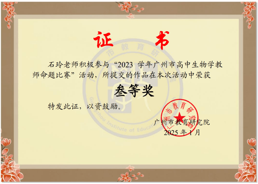 在“广州市教育学会生物学分会年会评选”中,我校生物学教研组荣获优秀教研组,石玲老师荣获“生物教研优秀青年教师”。