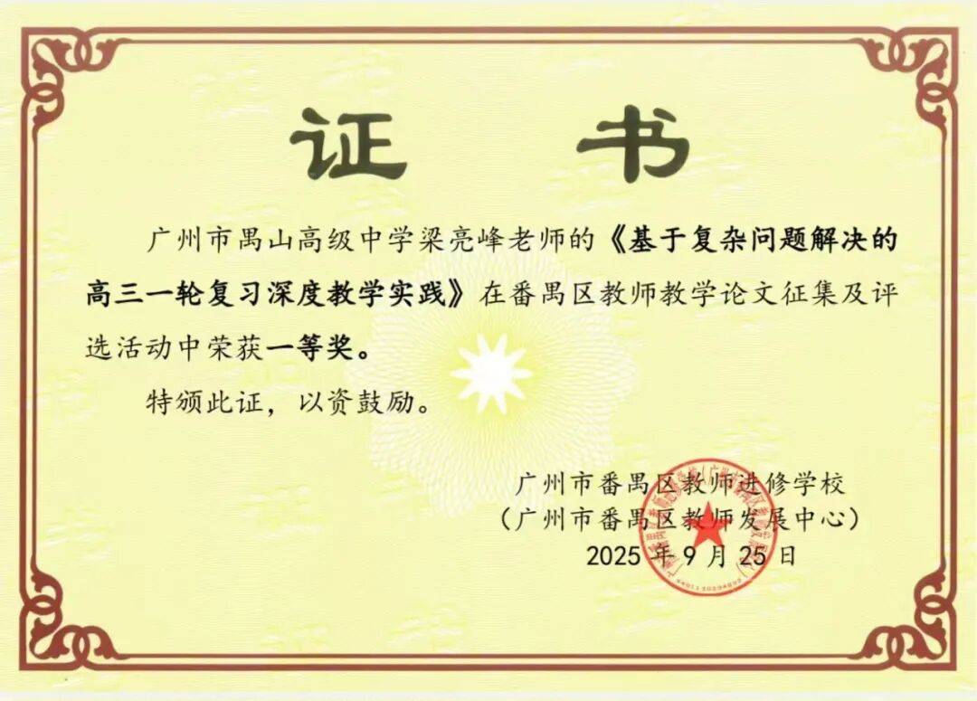 在番禺区教师教学论文征集评选活动中,梁亮峰老师荣获一等奖,叶贞老师荣获二等奖。