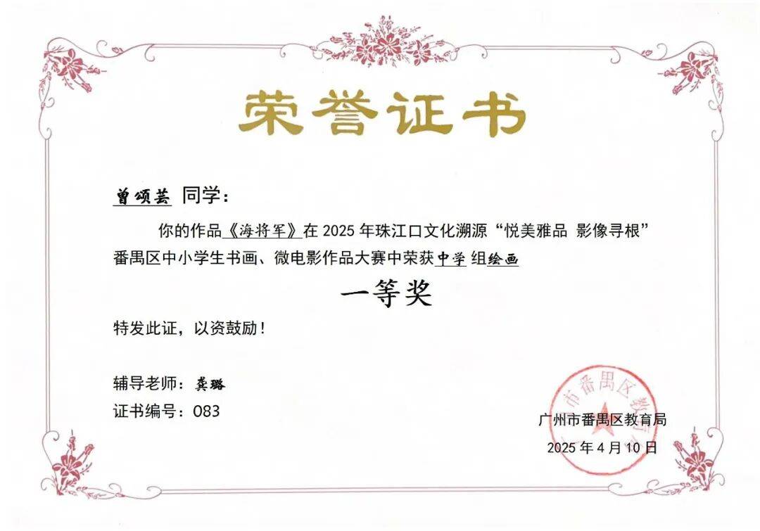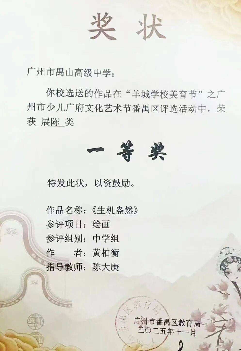 在“上品教化•艺韵校园”番禺区2025年中小学音乐、舞蹈、语言艺术个人才艺比赛中,我校多名学生获一等奖,陈春和、薛丹丹、罗嘉艳、王文珍、黄敏老师获优秀辅导老师称号。