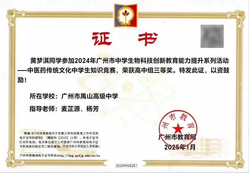 在广州市中学生物科技创新教育能力提升系列活动中医药传统文化中学生知识竞赛中,麦芷源、杨芳指导黄梦淇同学荣获高中组三等奖。