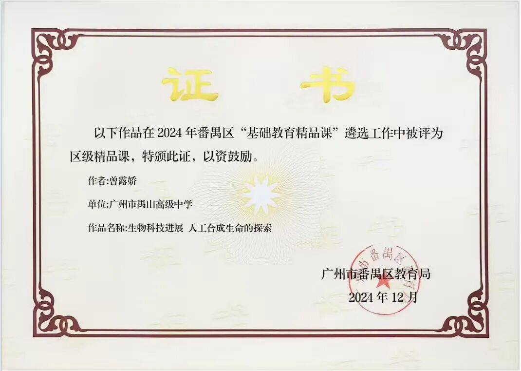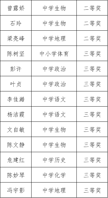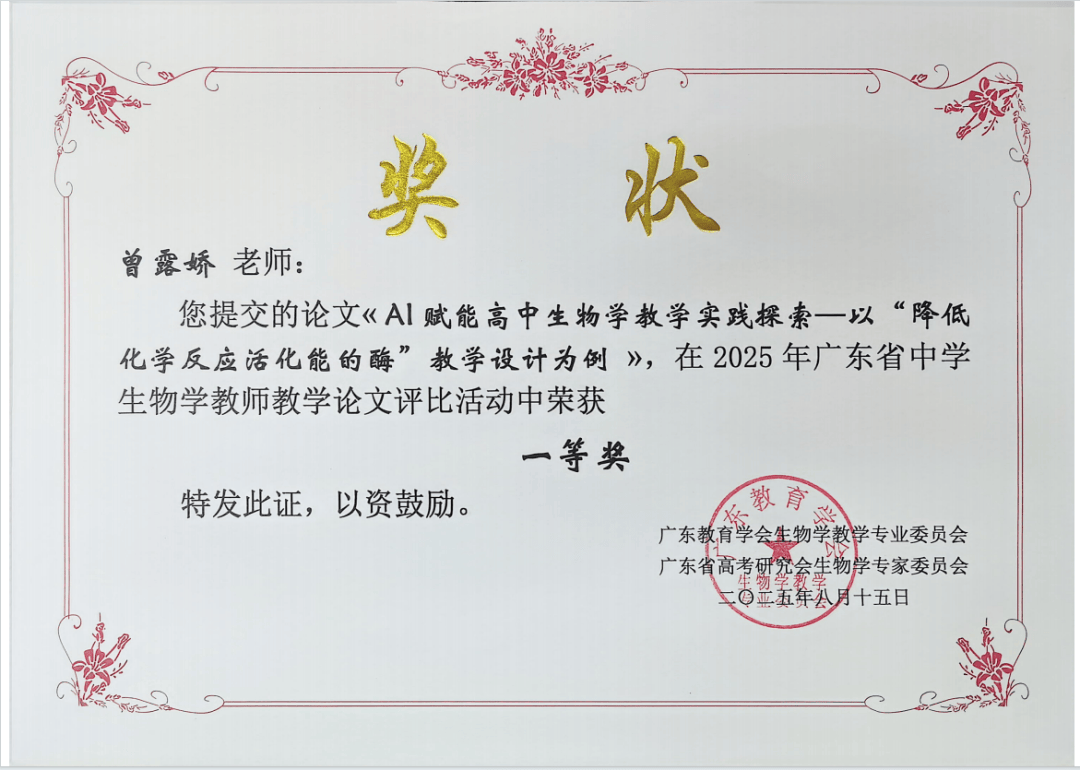 在2025年广东省中学生物学教师教学论文评比活动中,曾露娇老师荣获一等奖。