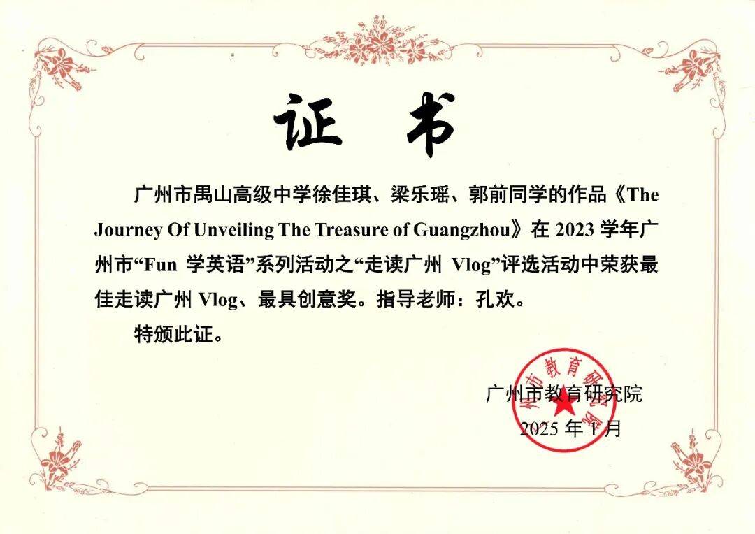 在广州市Fun学英语系列活动之走读广州 VIog评选活动中,孔欢、黄银燕、黄庭婷老师指导徐佳琪等7位同学荣获最佳走读广州VIog、优秀走读VIog、广州最具创意奖。