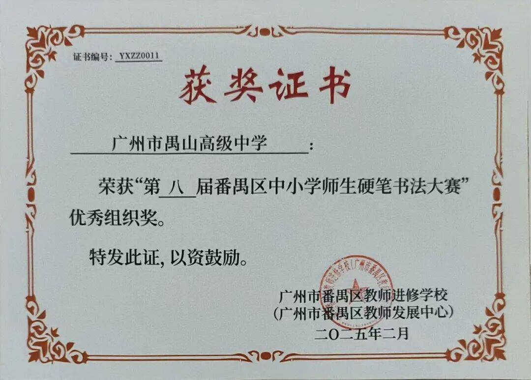 在第八届番禺区中小学师生硬笔书法大赛中,我校荣获优秀组织奖,袁珊、甘莉、谭信行、黄彦程、黎春芳、赵蕾、钟勇萍、邹先云、王一芝、李佳澔、杨小敏、赖派添、兰瑞红、黄紫蓝、石采玉、黄梓雯、彭惠慧等老师指导吴起帅等103名同学获奖。