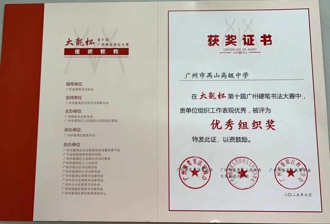 在大龙杯第十届广州硬笔书法大赛中,我校荣获优秀组织奖,彭军红、苏永峰老师指导黄子洋等49名学生获奖。