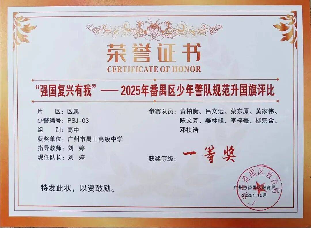 在“强国复兴有我”2025年番禺区少年警队规范升国旗评比中,广州市禺山高级中学国旗护卫队荣获一等奖。