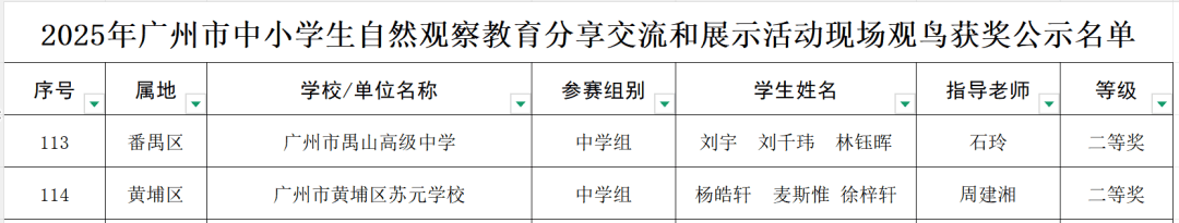 在2025年广州市中小学生自然观察教育分享交流和展示活动中,石玲老师指导刘宇、刘千玮、林钰晖等同学获市二等奖。