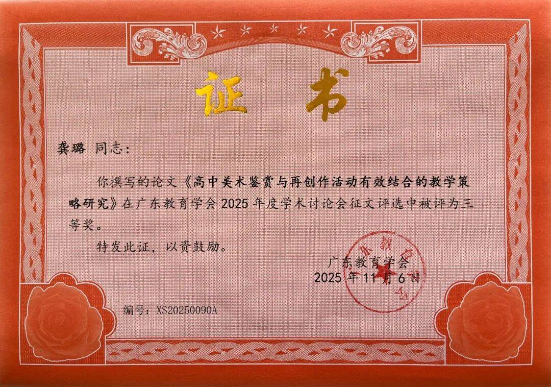 在广东教育学会2025年度学术讨论会征文评选中,龚璐老师撰写的论文被评为三等奖。