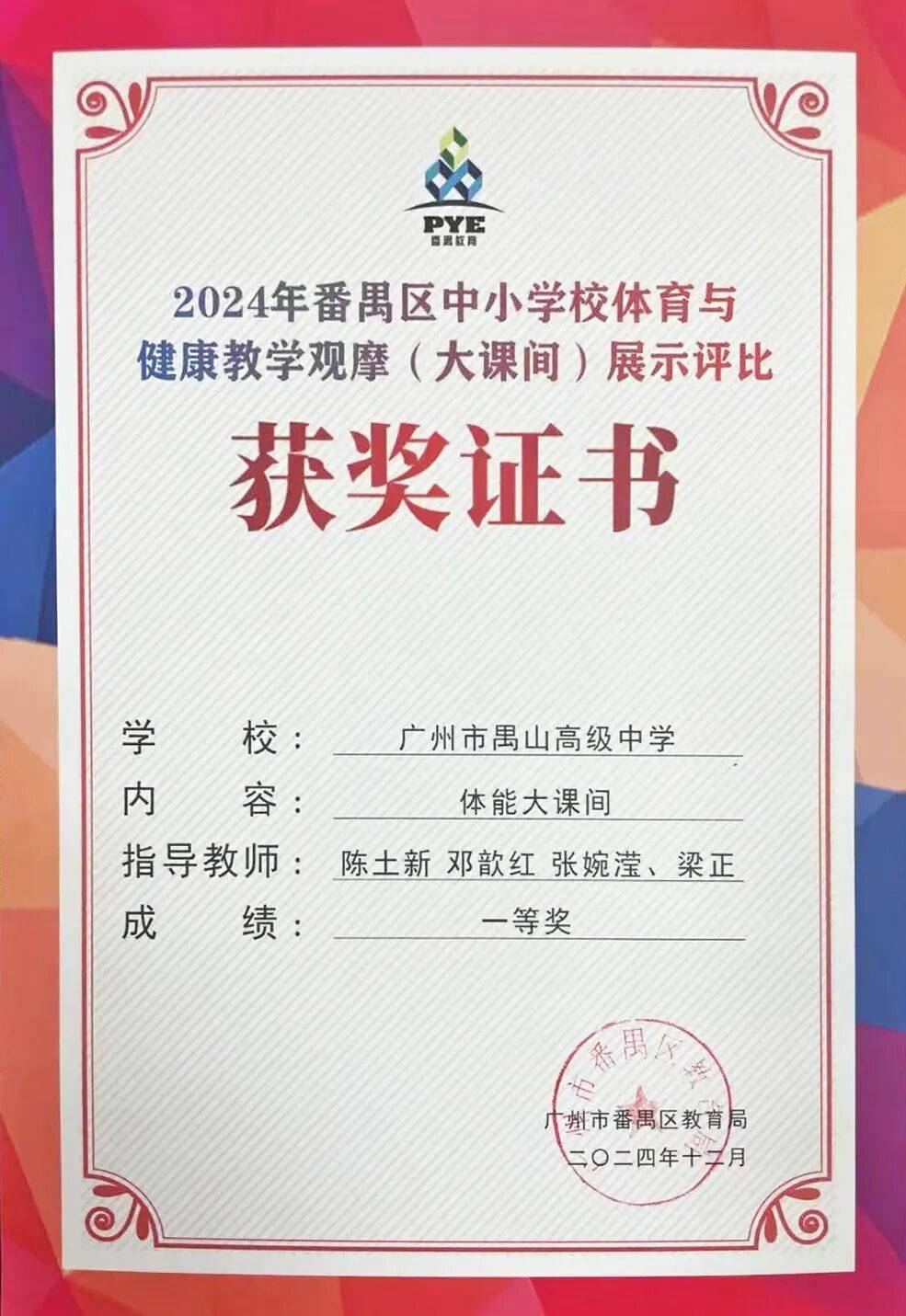 在2024年番禺区中小学校体育与健康教学观摩(大课间)(公开课)展示评比中,我校荣获“体能大课间”评比一等奖!黎永智老师的公开课《篮球——掩护配合》荣获“公开课”评比一等奖。