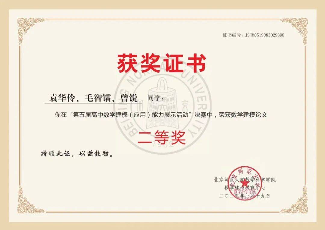 在第五届北师大高中数学建模活动决赛中,马明宇老师指导袁华伶等三位同学荣获二等奖,刘俊杰等三位同学荣获三等奖。
