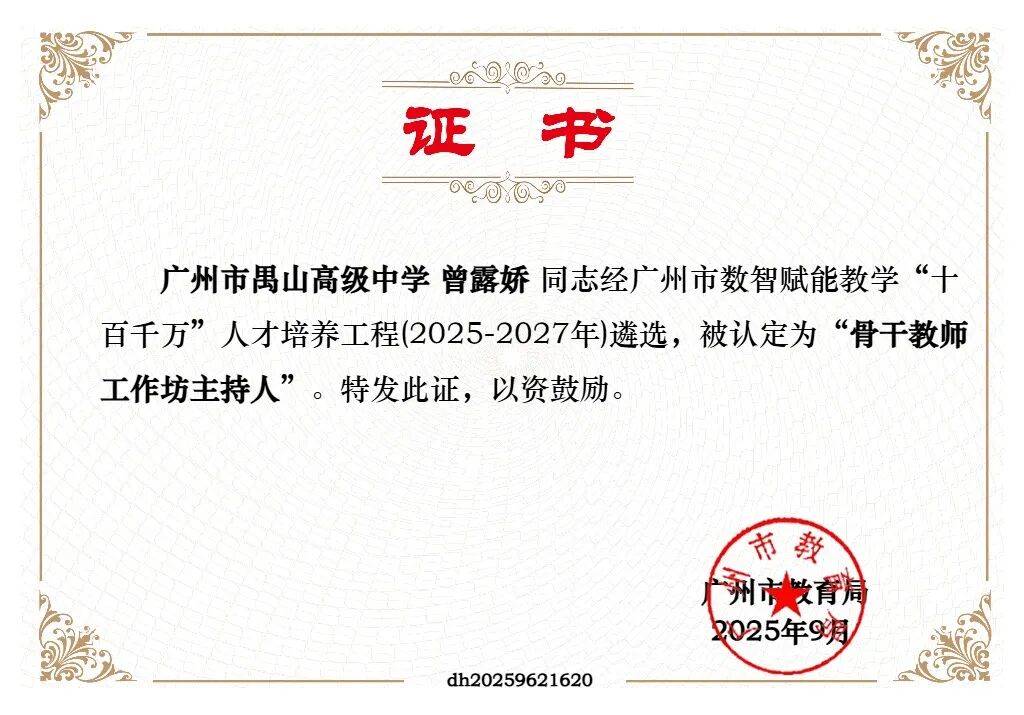 曾露娇老师被认定为广州市数智赋能教学“十百千万”人才培养工程(2026—2027年)骨干教师工作坊主持人。