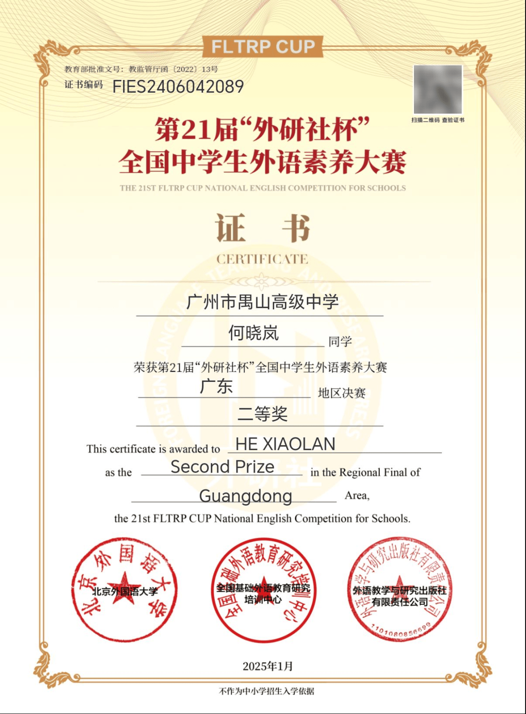 在第21届“外研社杯”全国中学生外语素养大赛中,黄银燕、黄铭欣老师指导学生何晓岚、苏悦航获广东省二等奖。