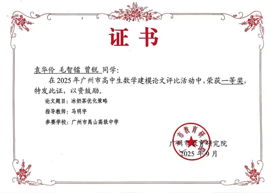在2025年广州市高中生数学建模论文评比活动中,马明宇老师指导袁华伶、毛智镭、曾锐同学荣获一等奖。