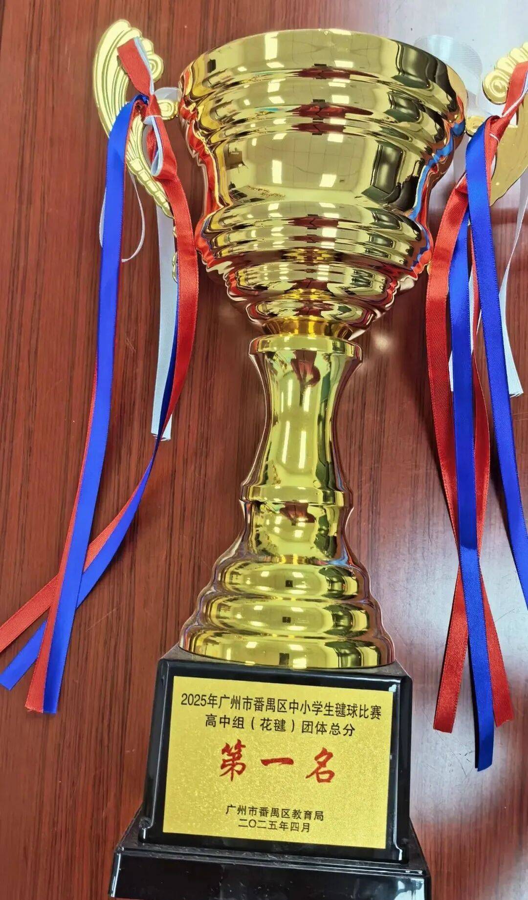 在2025年番禺区中小学生毽球比赛中,我校毽球队荣获高中组花毽团体总分第一名,网毽团体总分第二名,网毽男子三人赛第一名,男子双人赛、女子三人赛和女子双人赛均获得第二名。(教练:邓歆红)