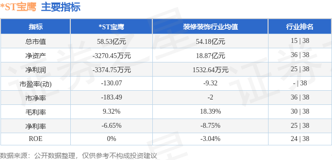 *ST宝鹰2025年三季报显示,前三季度公司主营收入5.15亿元,同比下降65.79%;归母净利润-3374.75万元,同比上升92.21%;扣非净利润-3412.11万元,同比上升90.64%;其中2025年第三季度,公司单季度主营收入2.03亿元,同比下降30.0%;单季度归母净利润-998.92万元,同比上升95.24%;单季度扣非净利润-1014.55万元,同比上升92.92%;负债率102.68%,投资收益-53.05万元,财务费用1426.14万元,毛利率9.32%。*ST宝鹰(002047)主营业务:装饰装修工程、幕墙钢结构工程、建筑总承包、集成智能化工程、建筑消防工程、机电安装工程、安防技术工程、专业洁净工程、金属门窗工程、展览展会工程。承接的项目包括机场、高端酒店、轨道交通、医院、剧院、学校、体育场馆、高档写字楼、商业综合体等公共建筑和住宅精装修、建筑幕墙等多种业态项目类型。