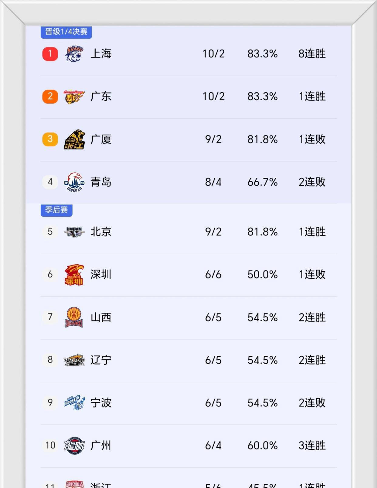 最新积分榜变化显著:上海凭借10胜2负升至榜首,广东同样10胜2负紧随其后,广厦、青岛和北京依次排列第三至第五。反观昔日总冠军四川队仍未尝胜绩,0胜11负位列垫底,亟待调整重振旗鼓。