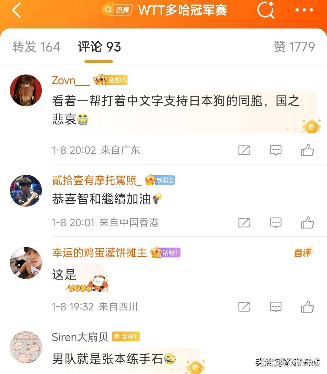 在整齐划一的祝贺声中,一条留言孤零零地挂在热评下方:“看着一帮打着中文字支持张本的同胞,国之悲哀。”