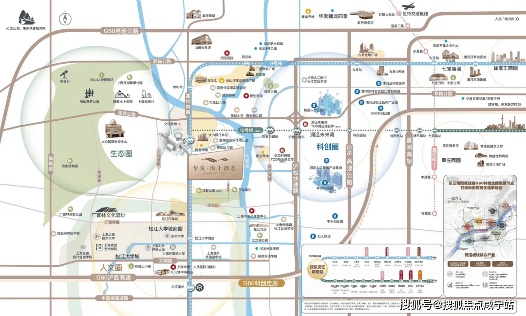 合心规划 产城样板:【“科创+人文+生态”城市单元示范】华发海上都荟首入松江,携崭新“优+产品体系5.0”,为洞泾、乃至为松江带来目前区域内综合高品质作品。结合上海生态环境保护“十四五“规划,站位国际领先的可持续性项目规划,华发海上都荟结合自身的独特聚合优势,在传统TOD规划之上,不可复制的土地生态资源,向东链接G60科创走廊“以镇命名为区块”洞泾人工智能产业基地;向南直达亚洲大学城之一——松江大学城;北侧紧连上海陆面自然山林资源——佘山国家旅游度假区。板块将区域打造成为“科创+文教+生态”交汇的核心新城模式,划立一个崭新的城市单元示范。