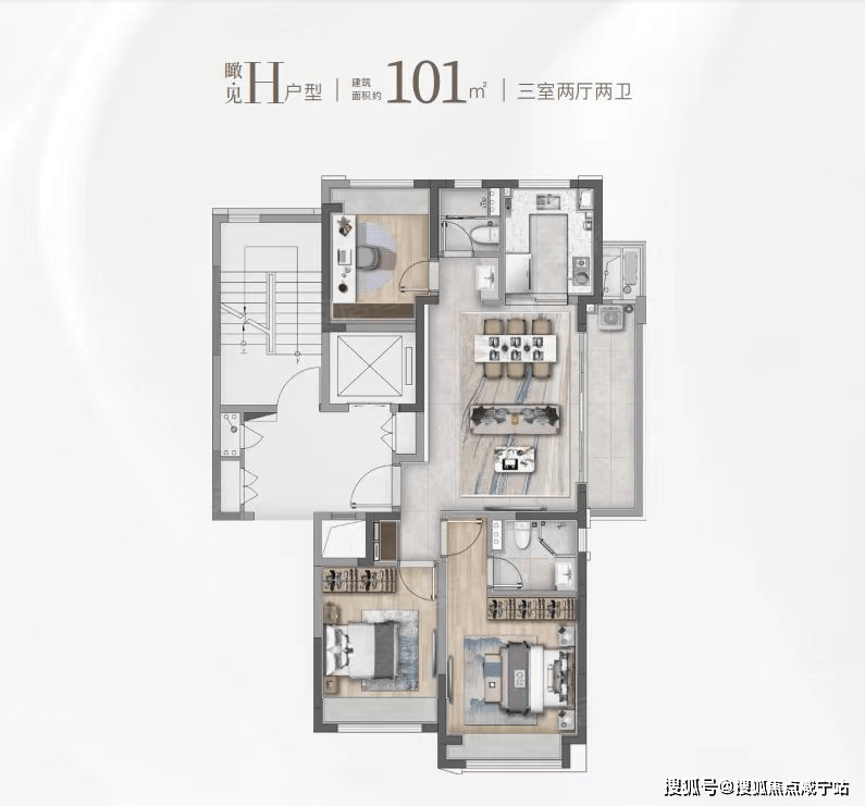 同样是3房2卫的配置,功能性与舒适度兼具。该户型惊艳的地方在于大尺度的景观边厅设计,搭配超大阳台,营造IMAX级别的客厅景观面,极具阔绰感!