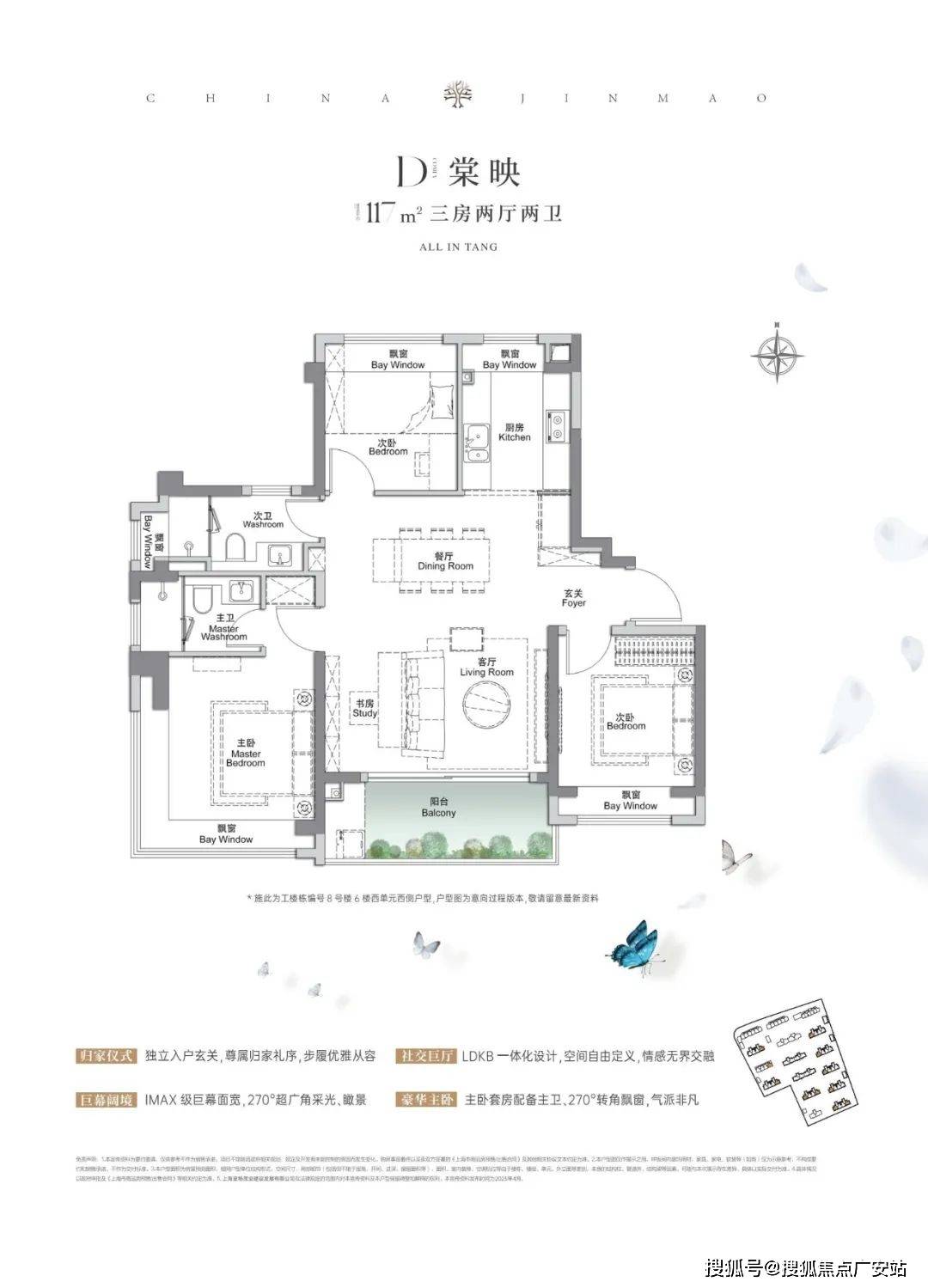 ㎡3房2厅2卫,空间布局非常相似,都做到了三开间朝南+多个飘窗+主卧套房设计+270°转角飘窗。