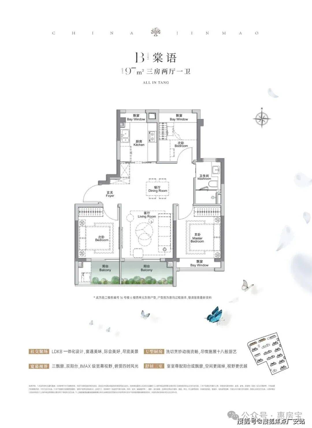 ㎡3房2厅1卫,户型三开间朝南、再加上“3个飘窗+双面阳台系统”,不管是采光、视野、通风、私密性,还是实用性都十分出色。