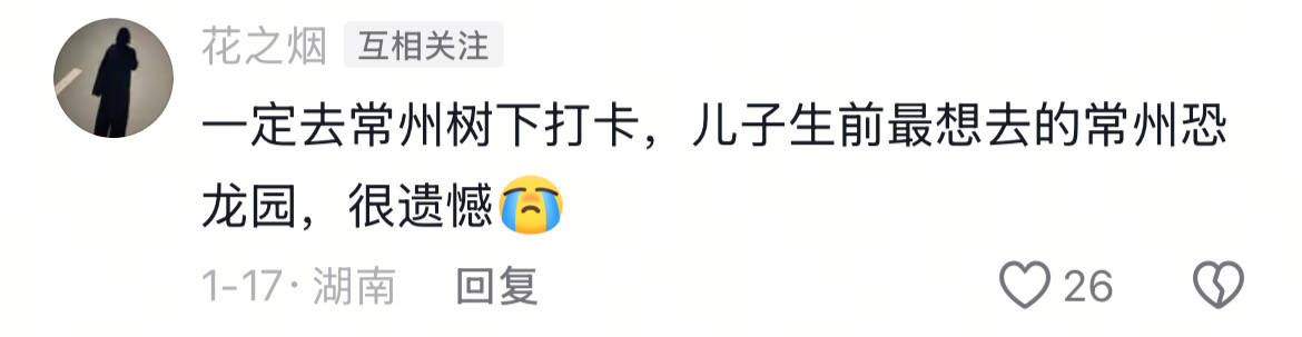 网络截图。1月17日,名为“花之烟”的湖南网友在这条视频下评论,“一定去常州树下打卡,儿子生前最想去的常州恐龙园,很遗憾。”因为忙于现场的活动,何先生一开始没有注意到这条评论。在这条评论下,有热心网友帮忙@文旅常州。