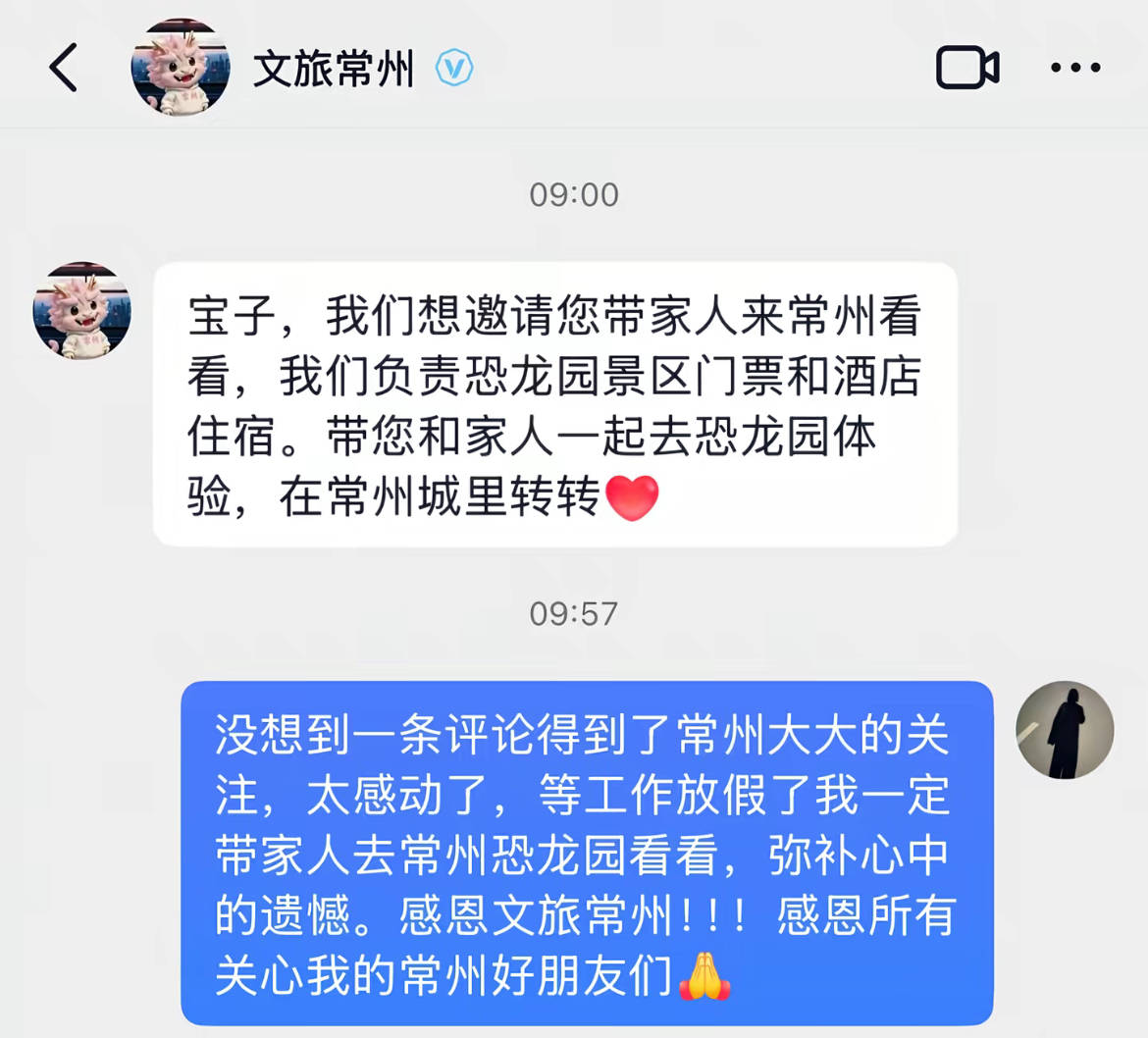 何先生告诉记者,常州文旅反应很快,先与“花之烟”取得了联系。得知她儿子因患癌去世后,常州文旅向“花之烟”寄去了纪念品,还邀请“花之烟”和家人来常州市和中华恐龙园看看,门票和住宿由他们负责。
