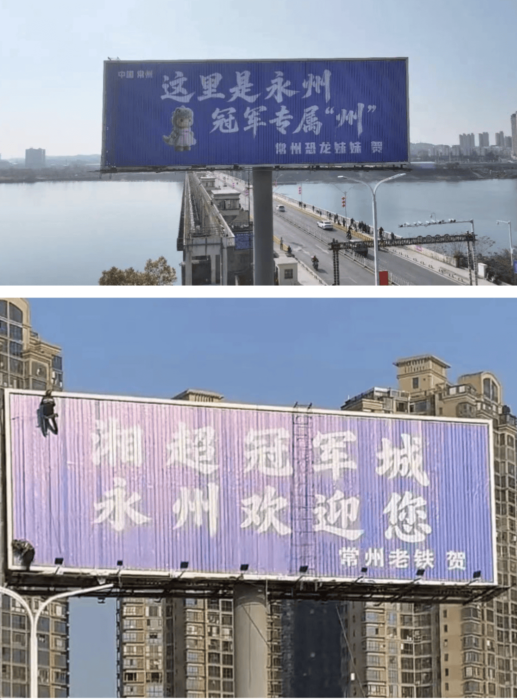 2025年12月27日,永州队夺得湘超冠军。“湘超”带起的“足球热”没有因为赛事落幕而停止。2026年,江苏苏州网友率先自掏腰包在永州大桥立牌祝贺永州队夺冠,江苏南京、泰州等地网友迅速跟进,形成一场善意的“广告牌接力”。江苏“十三太保”为永州喝彩广告牌,一时刷屏网络。