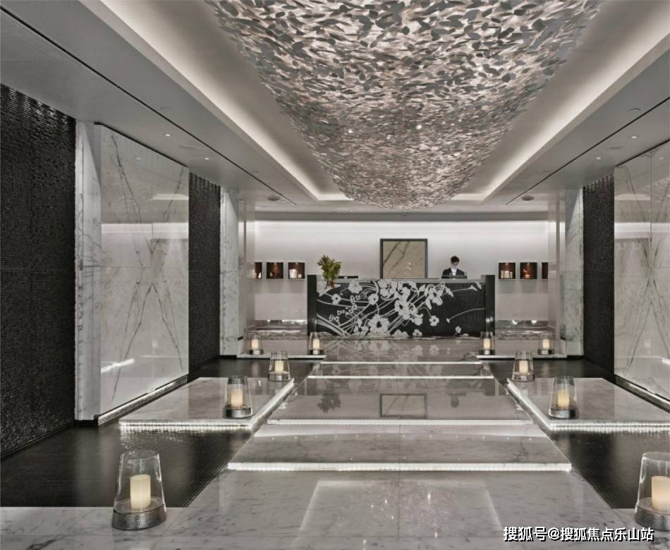 3、五星级入户大堂,地面全大理石水刀拼花、墙面干挂石材,镜面不锈钢硬包及金属镜面造型,菁装首层入户大堂,入户大堂约6米挑高,定制水晶吊灯,精雕细琢入户仪仗,用心铺排,动静相间营造极具尊贵的舒适体验
