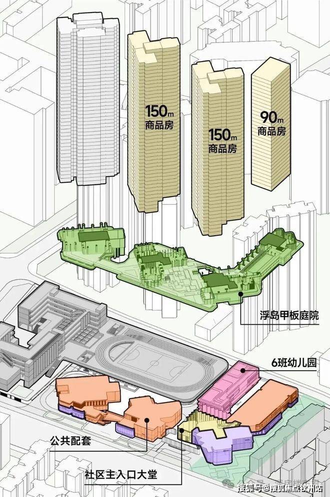 垂直共生模式:采用“浮岛甲板”策略,四栋住宅落于抬升的甲板层面,共享大型庭院花园,形成“超级社区底盘+浮岛绿化甲板”的垂直生态,实现底层立体花园、会所与上层居住空间的动静分离。